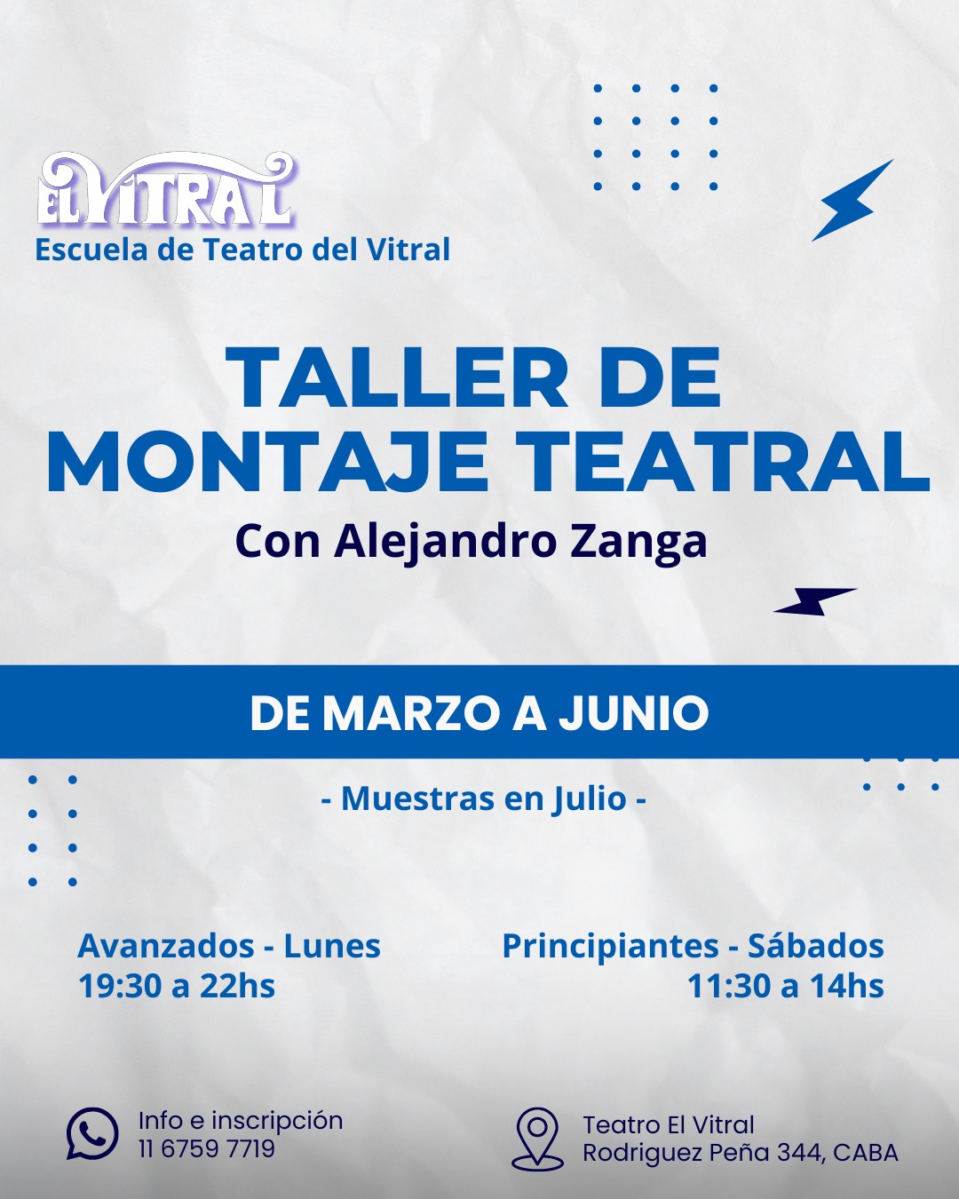 El Taller de Montaje es una experiencia única, te permite conocer en poco tiempo el recorrido de una compañía teatral desde que elije el texto hasta recibir el aplauso del publico. Una vez conformado el grupo entre todos elegimos uno o mas textos para llevarlos a escena. Esta elección será hecha en los primeros encuentros. Ya elegido el material se comienza con los ensayos. ¿Cual será la actividad durante los entrenamientos?ensayos? Durante los ensayos se realizará un entrenamiento físico y vocal, improvisaciones, abordaje al texto y todo lo que haga el acercamiento en busca de los personajes a interpretar. Luego se hace la puesta en escena, elegimos vestuarios, escenografía utilería, maquillaje hacemos una puesta de luces y a escena? Las funciones se realizarán en el mes de Julio en el teatro EL VITRAL. Para cualquiera de los cursos, tenemos que tener una entrevista virtual o presencial.